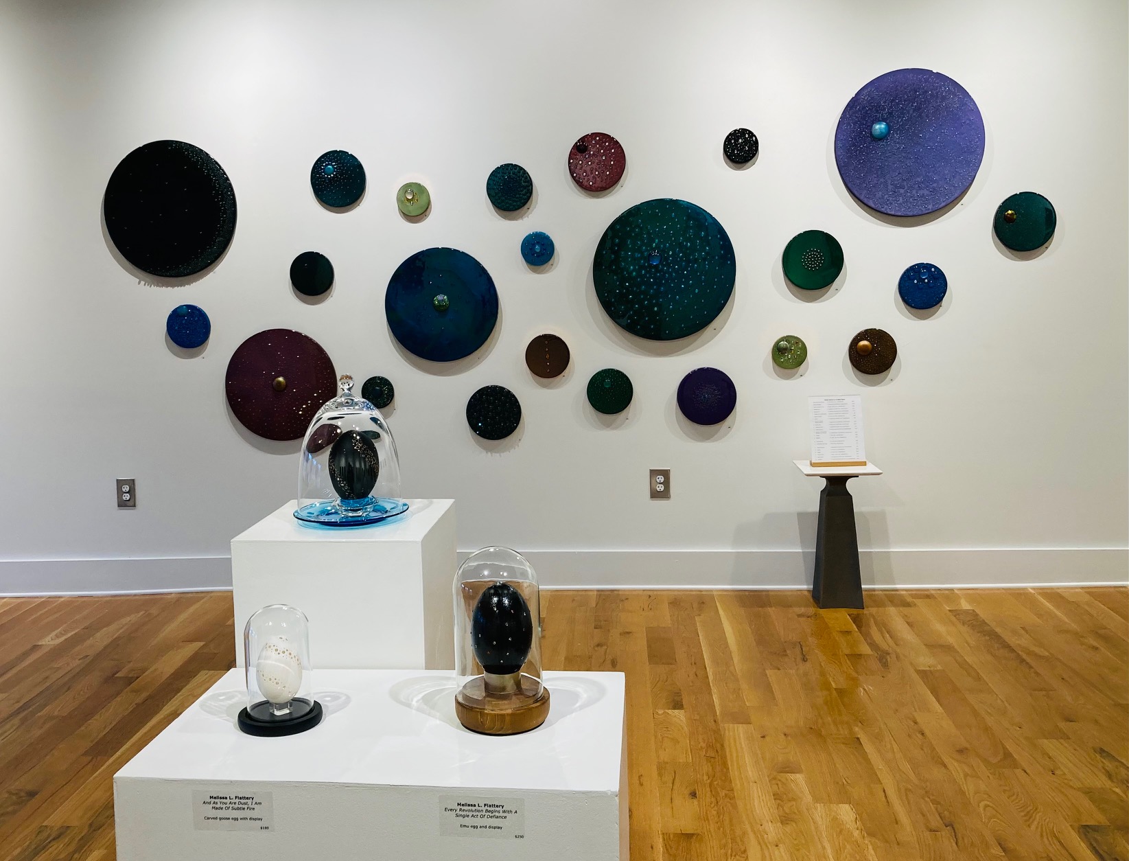 My paintings were characterized by bold colors and whimsical subjects. These abstract pieces utilized acrylic, alcohol ink, resin, and metal leaf and evoked a sense of joy and wonder. My eggs (ostrich, emu, rhea, and goose) were intricately carved, making each a unique and delicate work of art. My “Flattery Boxes” were adorned with beautiful papers and a wide variety of embellishments. The quilling pieces were made by rolling thin strips of paper into elaborate designs utilizing a variety of colors and patterns. My mosaic glass bowls were made from both sea and tumbled glass. The distinct jewelry pieces—primarily pins and pendants—were made from the beautiful and intriguing workings of antique pocket watches. The exhibit was full of life, energy, and wonder and transported those who experienced it to their happy place.